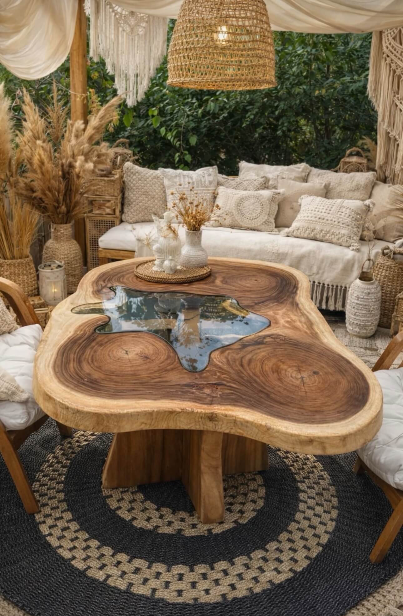 Cette table peut être mise en valeur avec quelques objets déco, une bougie, ou simplement laissée telle quelle pour en souligner l’aspect brut et naturel.
