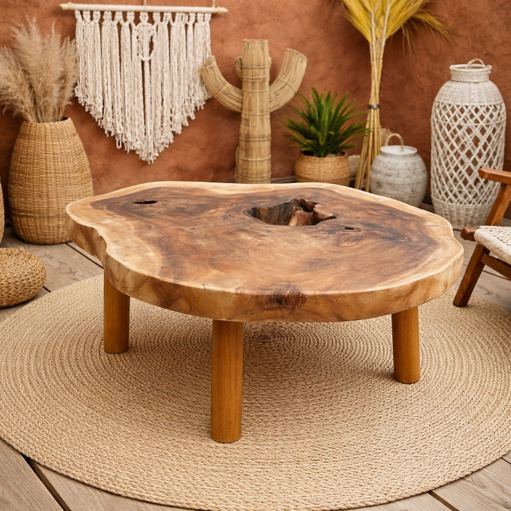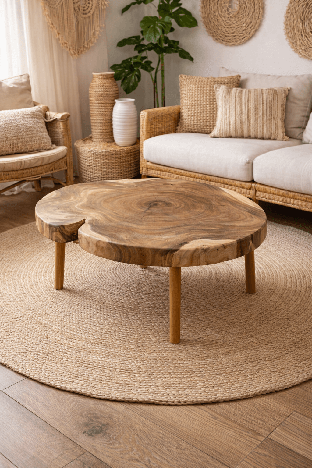 Fabriquée artisanalement à Bali, cette table basse en bois de suar massif est une pièce de caractère. Son plateau aux lignes organiques raconte l’histoire du bois, sublimée par une finition huilée qui révèle toute sa beauté.