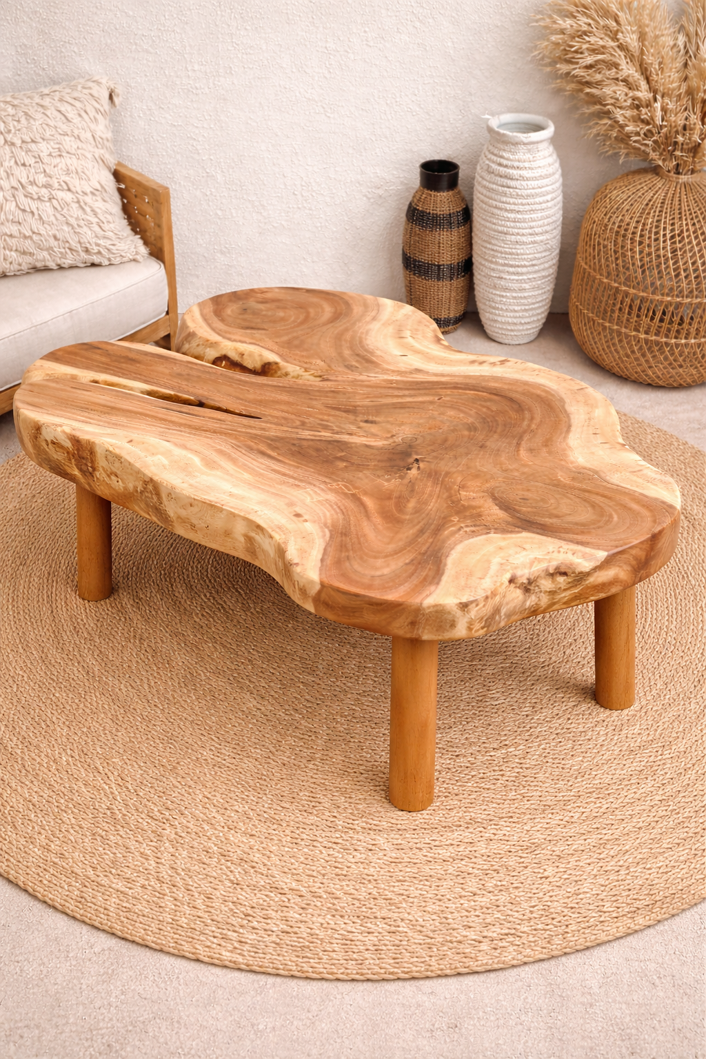 Fabriquée artisanalement à Bali, cette table basse en bois de suar massif est une pièce de caractère. Son plateau aux lignes organiques raconte l’histoire du bois, sublimée par une finition huilée qui révèle toute sa beauté.