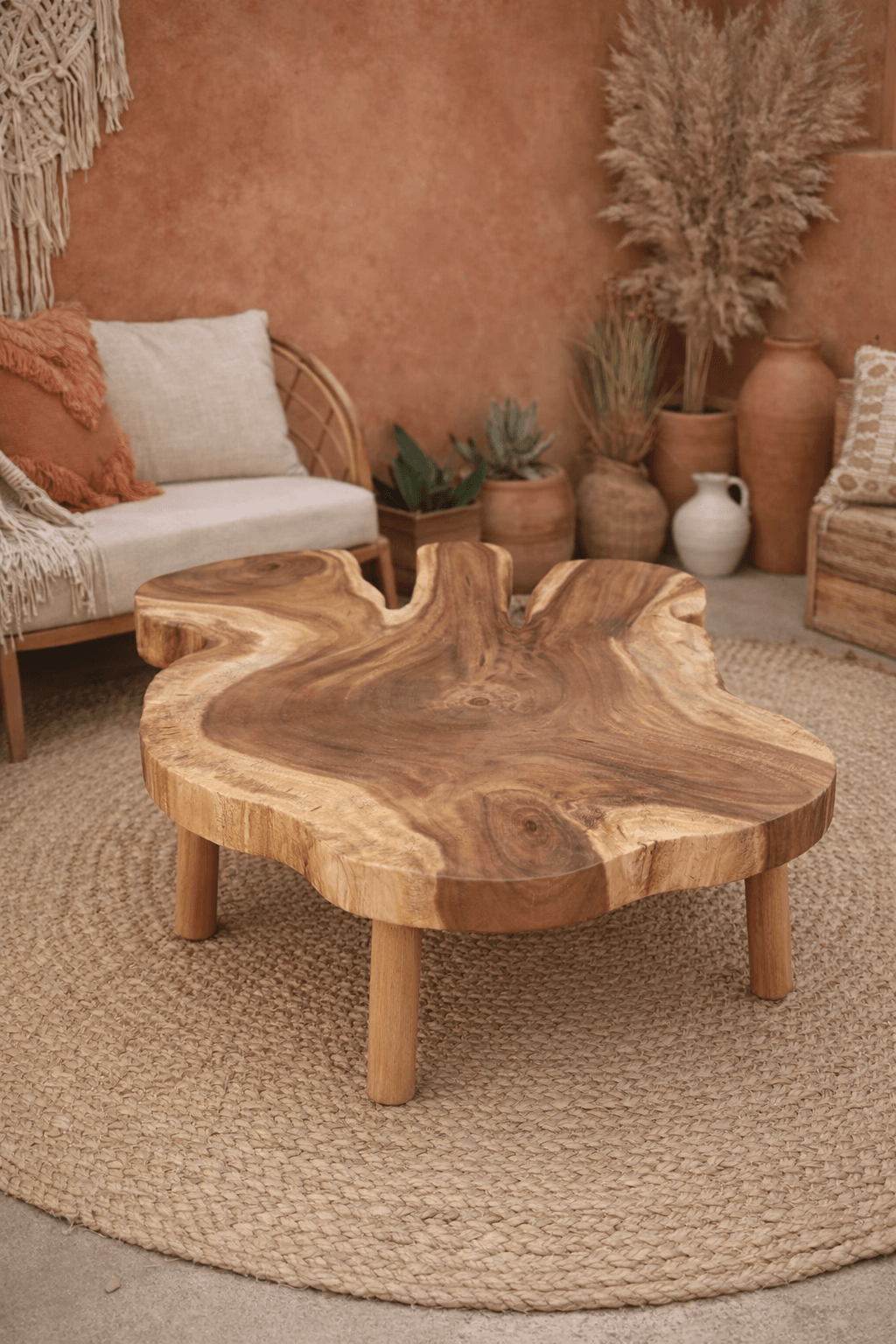 Fabriquée artisanalement à Bali, cette table basse en bois de suar massif est une pièce de caractère. Son plateau aux lignes organiques raconte l’histoire du bois, sublimée par une finition huilée qui révèle toute sa beauté.