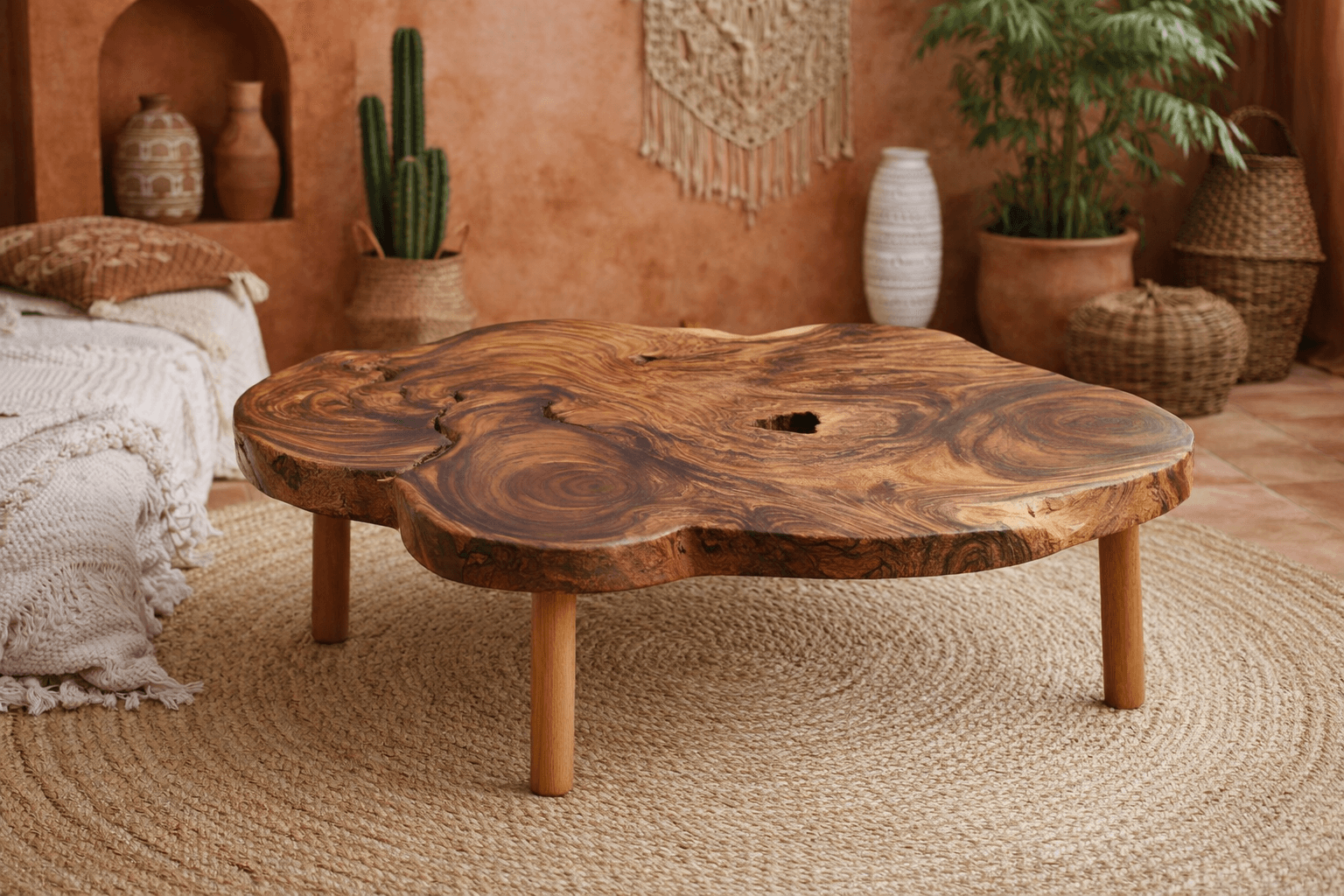 Fabriquée artisanalement à Bali, cette table basse en bois de suar massif est une pièce de caractère. Son plateau aux lignes organiques raconte l’histoire du bois, sublimée par une finition huilée qui révèle toute sa beauté.