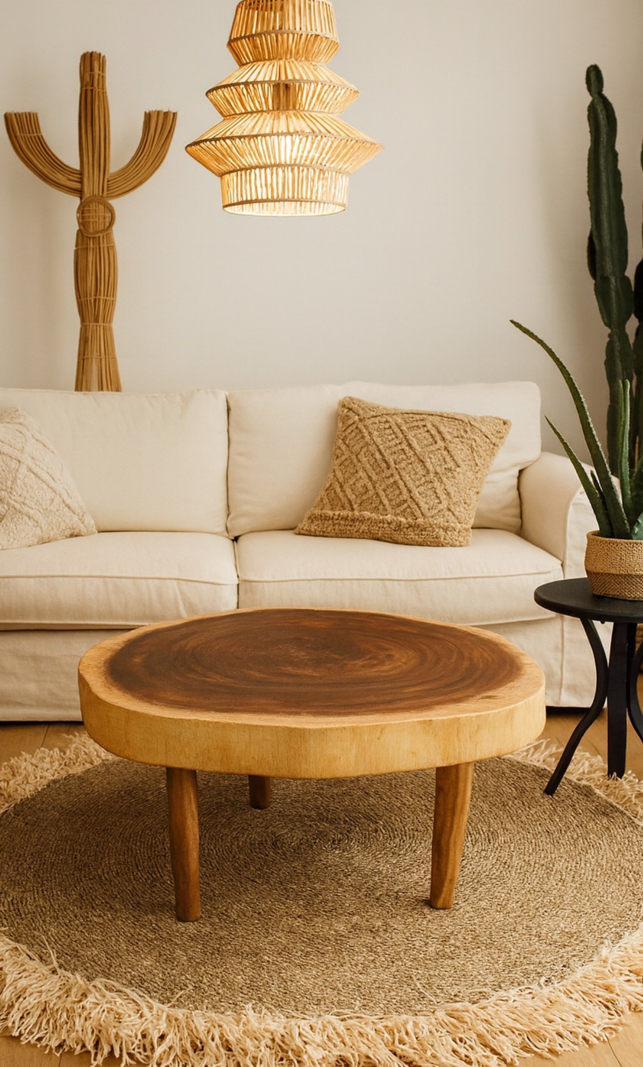 Fabriquée artisanalement à Bali, cette table basse en bois de suar massif est une pièce de caractère. Son plateau aux lignes organiques raconte l’histoire du bois, sublimée par une finition huilée qui révèle toute sa beauté.
