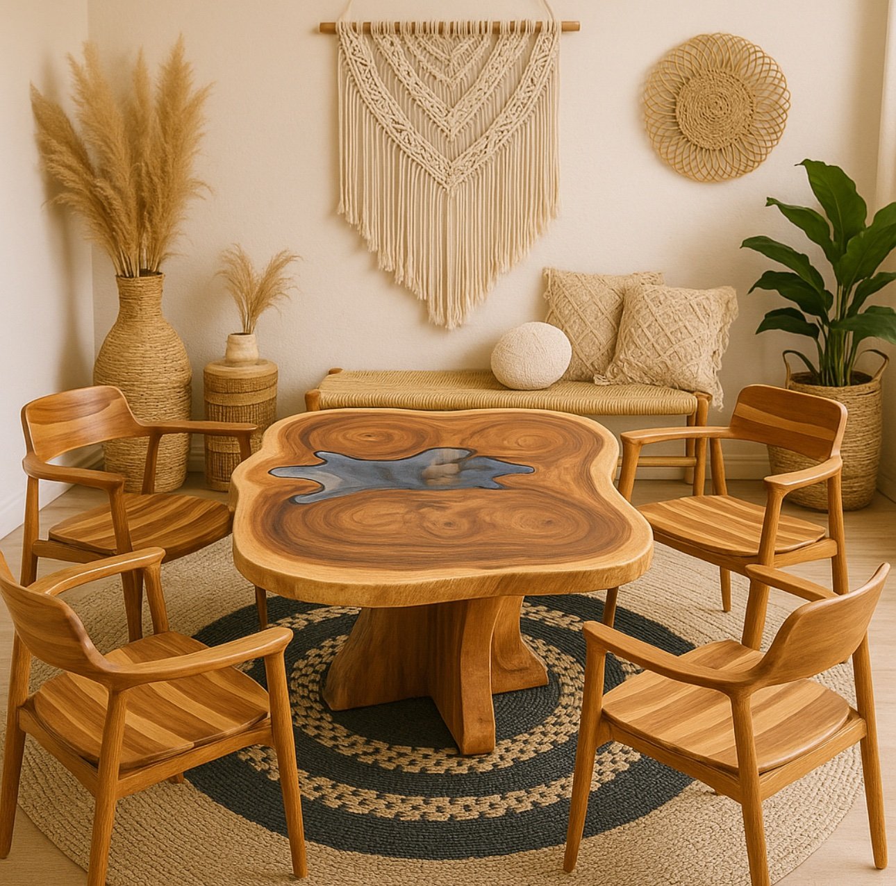 Fabriquée artisanalement à Bali, cette table à manger en bois de suar massif est une véritable œuvre d’art naturelle. Son plateau aux formes organiques et à la teinte chaleureuse met en valeur les veines spectaculaires du bois, tandis qu’un verre découpé sur mesure vient épouser les contours du tronc, offrant un équilibre parfait entre authenticité et modernité.